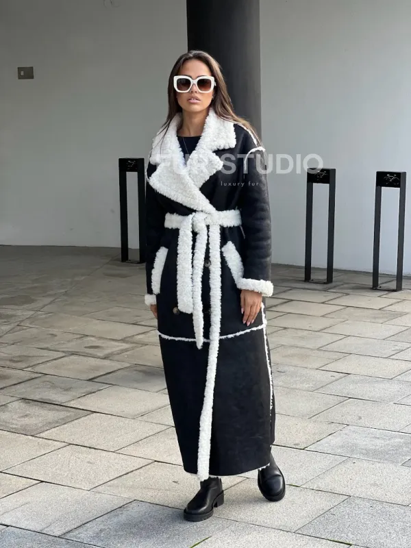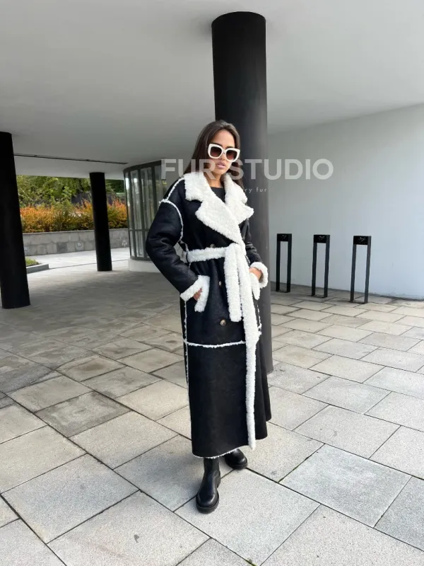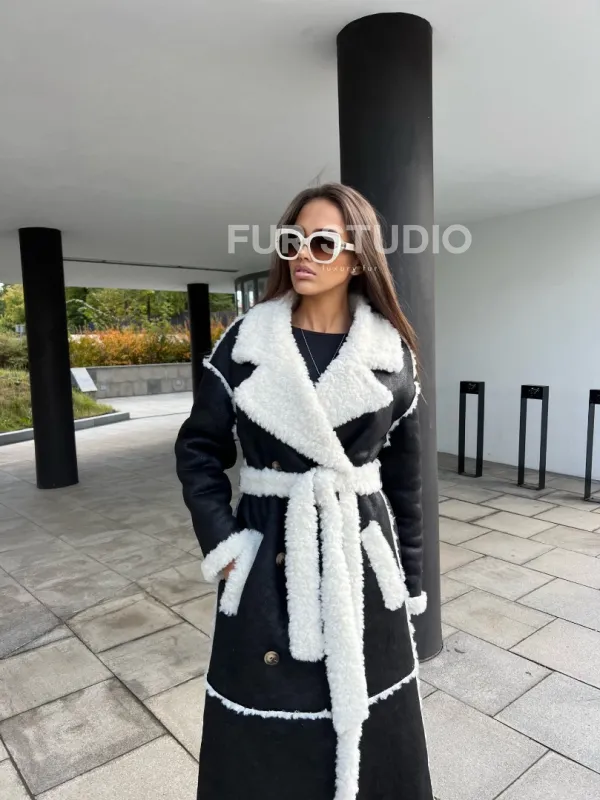 Черная дубленка из экокожи – выбор девушек с изысканным вкусом. Экокожа прекрасная альтернатива натуральной для тех, у кого ограничен бюджет. Длина изделия прикрывает все части тела, что идеально для любительниц голых ножек в холодное время года. Прямой крой зрительно увеличивает рост. Оригинальный пояс подчеркивает талию и создает силуэт фигуры «песочные часы».