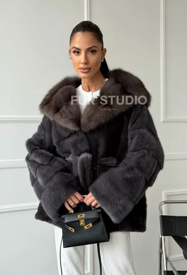 Графитовая шуба с капюшоном из куницы 102657