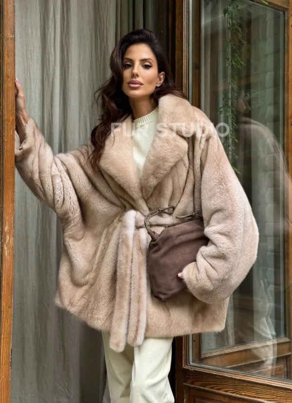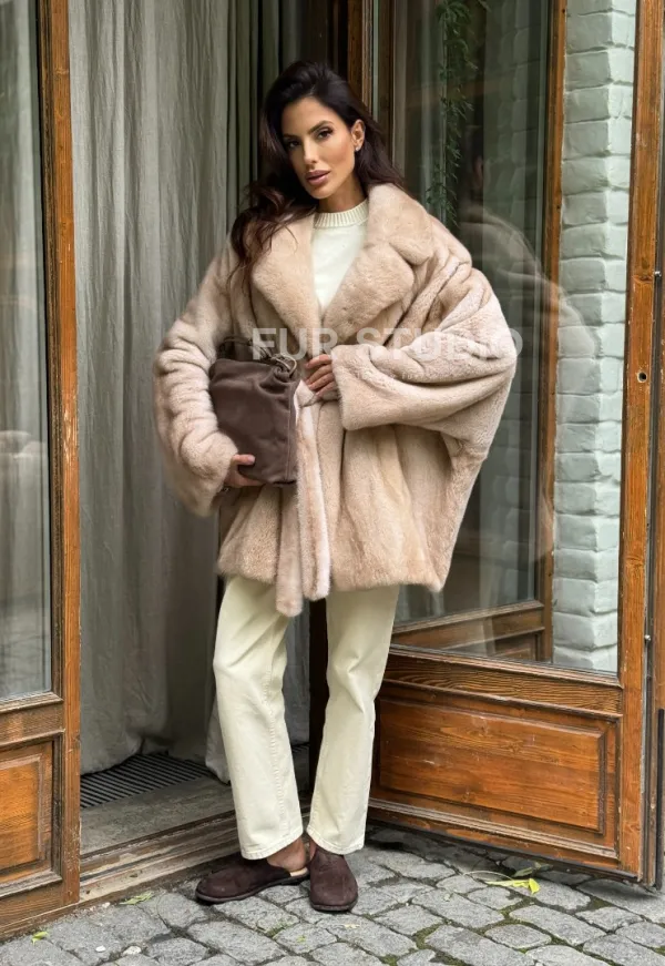 Мех данной шубы аукционная норка , цвет бежевый. Предлагается в размерах от 42 до 56 (oversize). Длина модели 75-80 см, что выгодно подчеркивает фигуру девушек. Эта модель идеально подойдет для девушек и женщин, предпочитающих роскошные натуральные меха.