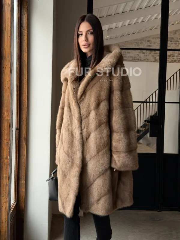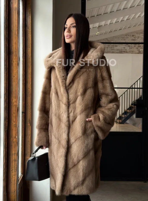 Норковая шуба с капюшоном - цвет пастель 100849