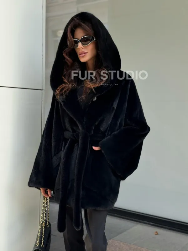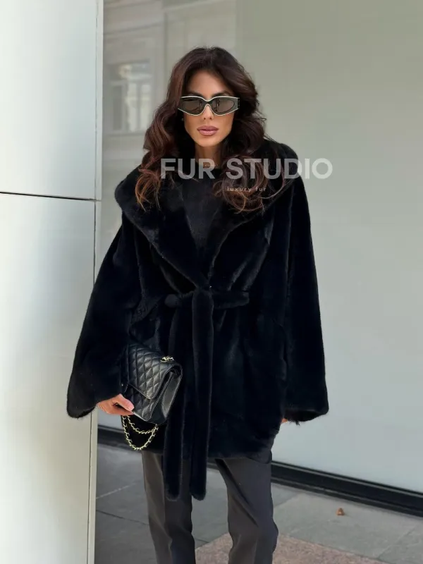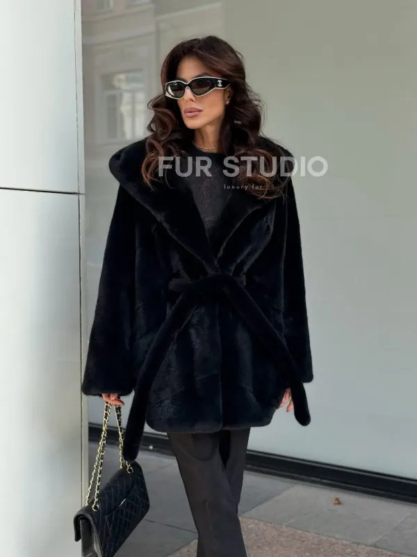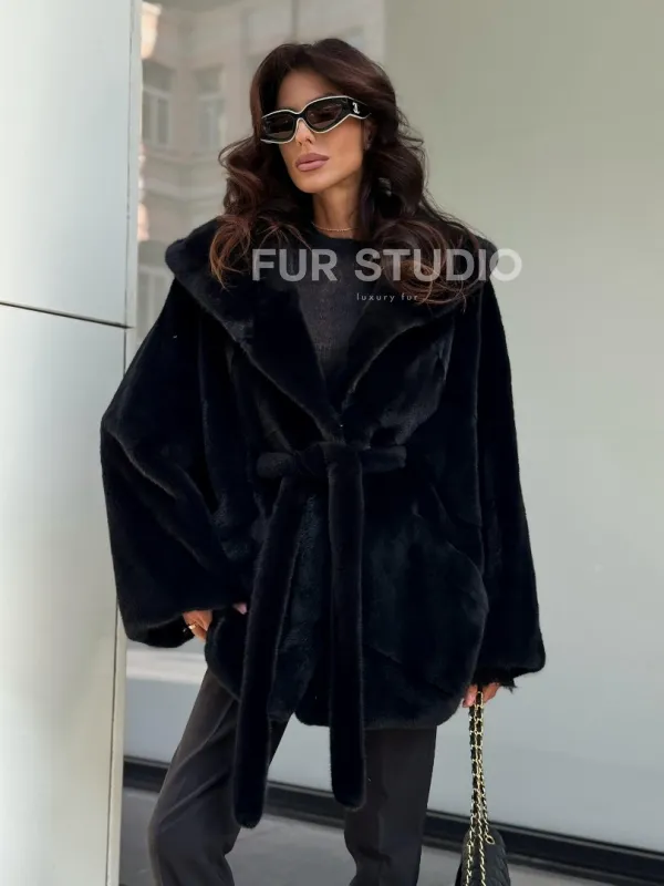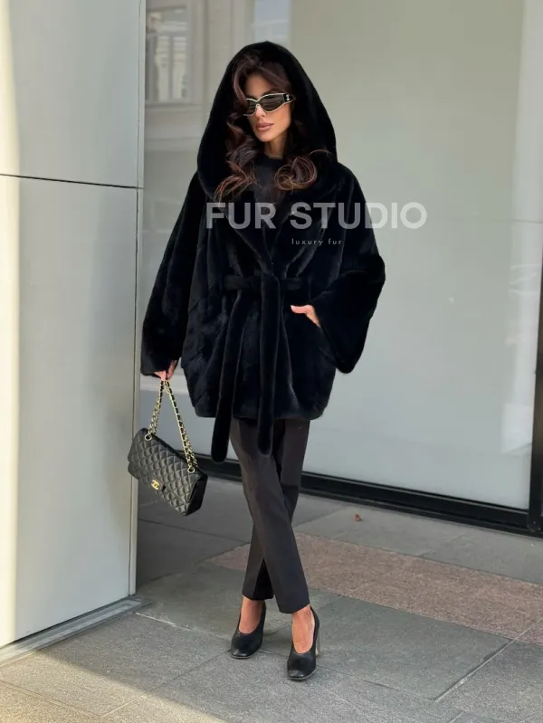 Пончо из норки с капюшоном кобра - черно-синий 102270